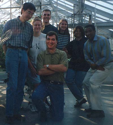 "This is the Gage Lab as we knew it. The one kneeling in the center is Dr. Gage. He was great to work with. On the right is the graduate student Wayne, who is still there. I am next to him, and Cheryl is next to me. Cheryl and I were good friends, lab partners on the MMT product, in the same class and major, and roommates. We were each others shadow around the biochem department the last couple of years. The tall guy in the back is Bill. He is actually taller than he looks, he slouching to fit into the picture with the angle it was being taken (so was Cheryl -- she is over 6 feet, and Bill was significatly taller than her). He graduated in December 1999 with a Criminal Justice major. He began as the lab dishwasher and ended up running many of the HPLC and other experiments by the end. He is now a police office for the city of Detroit. I know I wouldn't want to be arrested by him! Next to him is his sister Stacy. She was the one who got Bill into the lab, becuase she worked there when she was an undergaduate. For the last couple of years (since she graduated) she has worked in Dr. Lyckem's lab just upstairs, but she often still comes down to run experiments on the MALDI-MS. She is a friend and scooby-do fanatic. Next to her is the post-doc that was assigned to keep Cheryl and I from burning down Biochem. That is Tun-Li, and he was a great boss. I am sure he knew we were all nuts, but that didn't stop him from joining us in our lab mini-parties and all night purifications!"